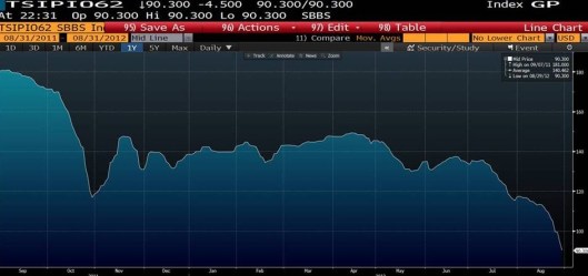 Another exciting day in store with very little change on overseas markets..we wait for Ben but not sure that will sort anything out..expect disappointment…and you won’t be disappointed…the big story is the Iron Ore price struggling at $90 a tonne..conventional wisdom said that it was never going to get this low and many brokers still have much higher forecasts in mind…now the price has fallen 40% since May!!!Scary…I would not be looking at the resource trade anytime soon and feel that there is some more downside to come in BHP,RIO,FMG (Sorry Charlie, maybe Jim is right…) and AGO…it is going to get worse before it gets better..so the question is at what price will the Iron Ore price settle and when do you buy the bulk material stocks…I believe that we will see Iron Ore at low 80’s in the coming months..BHP will slip below 30, RIO below 47 and FMG will touch 3…this will knock the stuffing out of the ASX 200 which is looking toppy and cum div ,cum stimulus expectation and cum hope…I believe that it’s about to go ex everything and dribble back down…The Aussie dollar will also come under pressure as a result.