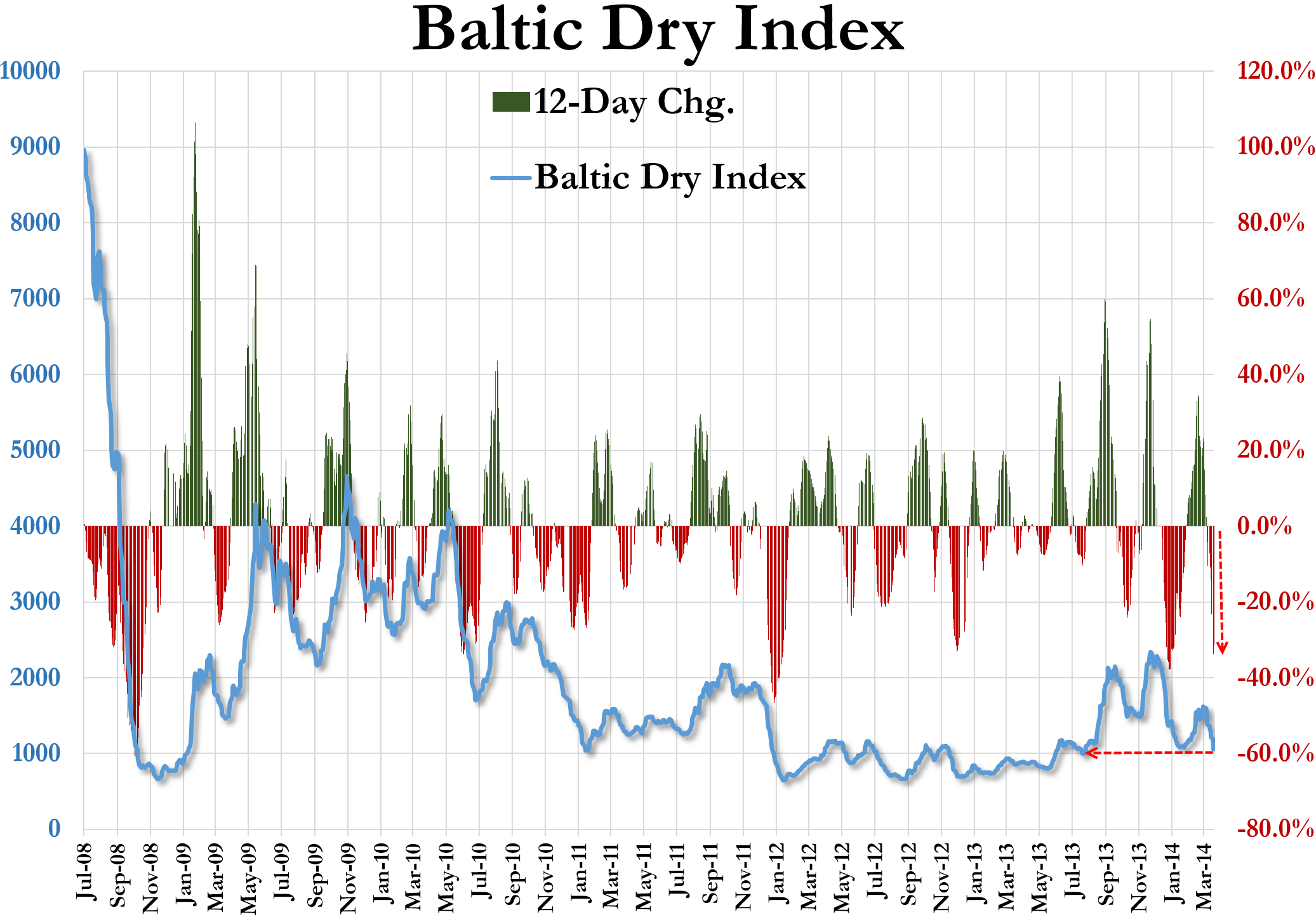 The Baltic Dry(which is the cost of shipping bulk stuff around the globe and looked at as an economic indicator) has dropped 12 days in a row and is now back to its lowest levels since August 2013… and almost post-crisis lows…