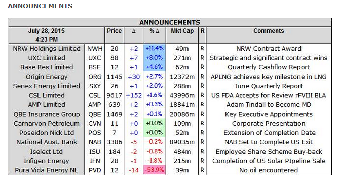 Senex (SXY) +2 % after Sales revenue for the June quarter was $23.6 million, up 6% on the previous quarter with a higher average realised oil price partially offset by slightly lower production. The FY15 sales revenue result was $115.9 million, down 32% on the prior year, primarily due to the material fall in crude oil price. Senex remained in a strong financial position with total liquidity of $129 million at 30 June 2015, comprising $49 million of cash reserves, and $80 million of undrawn debt.