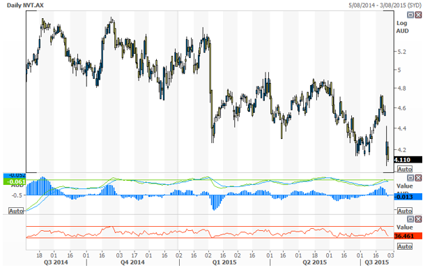 Navitas (NVT) -3.28 % as the shares fall to a 30 month low as the continued weakness on university enrolments and broker downgrades flow through.