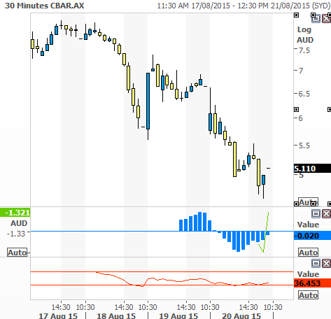 - The banking sector was once again under pressure with Commonwealth Bank (CBA) – 2.79% still under the most pressure with the rights (CBAR) – 23.16% showing how geared these rights are., but Macquarie Group (MQG) – 2.37 % also continued to slide as did other wealth managers like Platinum (PTM) – 3.79 % and Henderson Group (HGG) – 1.86%. AMP – 1.75 % were also weaker following the results, and REITS followed suit.