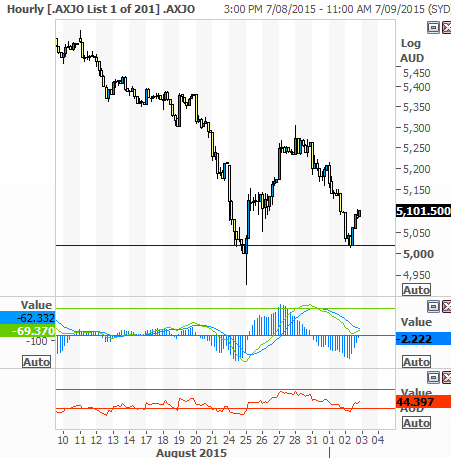 ASX 200 gains 5.1 points to close at 5101 (no conspiracy here) after a strong bank rally saves the day. US futures up 150 with China rallying to positive territory before they close for WWII holiday. Good volume in index futures and 80 point range as support holds.
