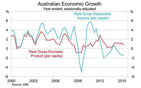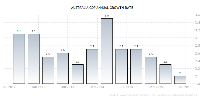 - GDP was the focal point today with 0.2% growth a big miss as exports fell. This means that the economy grew at 2% over the year, which opens the door to the RBA next time around. The AUD fell below 70 cents for the first time in six years as nominal GDP growth was the weakest since 1962.