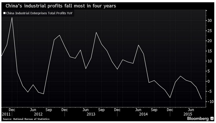 - Industrial profits tumbled 8.8% in August from a year earlier, with the biggest drops concentrated in producers of coal, oil and metals, the National Bureau of Statistics said Monday in Beijing. It was the biggest decline since the government began releasing monthly data in October 2011. Profits in coal mining plunged 64.9% in the first eight months of this year from the same period last year, while oil and gas profits tumbled 67.3 %.