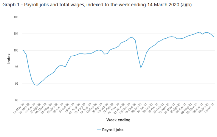 - Payroll jobs decreased by 1.0% between the weeks ending 19 June and 3 July 2021.