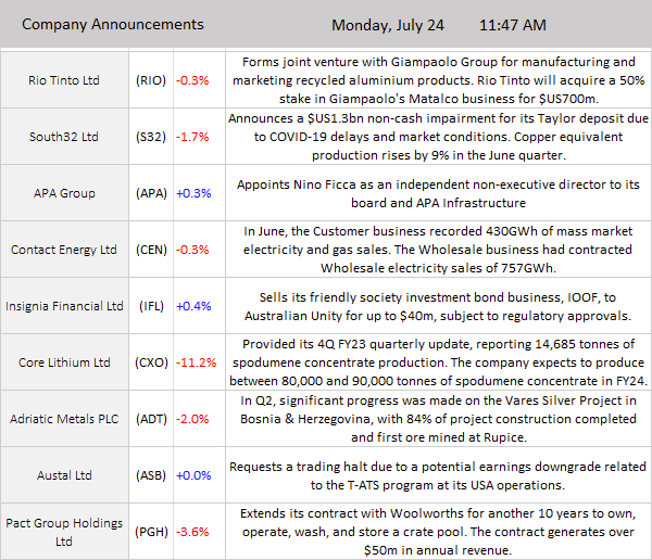 ASX finished down 8 points to 7306 (-0.1%) in a subdued day of trading ahead of CPI release on Wednesday, with forecasts of a further decline in inflation MoM. Energy the biggest gainer as Crude continues to gain, WDS and STO both gaining 2.3% and 2.2%. Banks continuing to ease off from last week, while MQG gained 0.4% ahead of AGM on Wednesday. The Big Bank Basket fell to $179.2 (-0.2%) with CBA down 0.1% and ANZ off 0.2%. Insurers better with QBE up 0.1%. REITs gaining as bond yields fall with GMG up 0.9% and SCG up 1.5%. Healthcare flat, held down by CSL down 0.3% while RMD and TLX gained 0.4% and 7.7%. Tech continuing to gain after last week’s run. The All–Tech Index up 0.4%, as WTC gained 1.9% and XRO dropped 1.2%. Resources are mostly down as China fails to stimulate demand BHP off 1.5% and RIO off 1.3%. Gold miners mostly down, EVN down 0.3% and NST dropping 0.7%. Base metal and lithium stocks hit hard, MIN -2.6%, PLS -5.8% and AKE -5.6%. In corporate news, CXO dropped 17.2% after releasing their quarterly results, failing to impress. S32 lost 2.6% after incurring a $US1.3bn non-cash impairment. On the economic front Aussie manufacturing PMI increased to 49.6, the highest in five months, but still indicating worsening business conditions. New Zealand’s trade surplus narrowed last month to NZ$9m. Asian markets mixed, Japan up 0.8%, HK down 1.9% and China off 0.1%. 10-year yields steady at 4%. Dow futures down 32 points. NASDAQ futures down 5 points