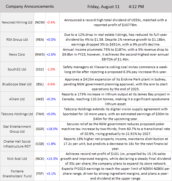 ASX 200 slid 17 points to 7340 (+0.24%) in quiet trade dominated by results again today. For the week, the index is down 0.85%. Broad based weakness today, nothing spectacular though. Banks eased after CBA results and Phil Lowe talked up rates in Canberra. The Big Bank Basket down to $180.46 (0.1%). Insurers mixed, QBE slipped 0.3% despite broker upgrades. Fund managers also squeezed slightly higher. MFG up 1.8%. Industrials were flat, healthcare better led by CSL up 0.6% and RMD up 0.6%. REITS slightly firmer with GMG down 0.4% the exception. Tech stocks eased back with XRO down 0.2% and WTC falling 1.5% with the All–Tech Index down 0.4%. In resources, iron ore stocks down again, FMG off 2.2% with RIO falling another 0.6%. Lithium stocks on the nose today with PLS down 1.1% and MIN off 1.7%. Energy stocks also weaker, WDS down 2% on crude falls and strike threats. STO off 1.6% with coal stocks sold down, WHC off 2.0% and BCB down 4.2%. In corporate news, SGR is up 18.0% on a softly, softly NSW government tax regime, NCK rose 13.3%, so far so good, CTT founder sold down, stock up 5.4% and BBN fell 1.9% on well-guided results. In economic news, it was all about the US CPI, although Phil Lowe spent his last uncomfortable day in Canberra with some regrets, he had a few. Too few to mention. Asian markets weaker, China down 1.3% and HK off 0.7%. Japan closed for Mountain Day. Dow futures up 29 points. NASDAQ futures 23 points.