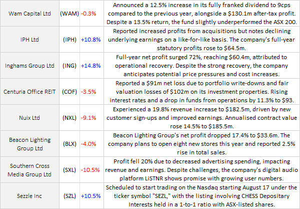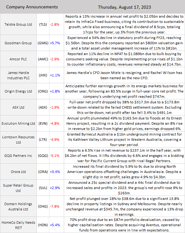 ASX 200 closed down 49 points at 7146 (-0.7%) as China and US worries weighed. Super Thursday results also disappointed from TLS to NXL. A worse-than-expected jobs number at 3.7% helped the ‘RBA is done’ narrative and caused a rally off the lows but lacked conviction. Banks were mixed with the Big Bank Basket down to $173.41 (-0.8%). MQG fell hard down 2.0% with insurers mixed. QBE down 1.6%. Healthcare also in trouble today, CSL off 0.7% and RMD snapping back to reality after outperforming in the storm. REITs mixed with results in focus. GMG up strongly 5.7%. Industrials weaker across the board with TLS down 2.8% after aborting plans to sell its infrastructure business. Consumer stocks eased too, WOW off 1.7%, COL down 1.5%, and TCL copping some downgrades off 4.9%. Tech eased but did recover with the All–Tech Index up 0.4% WTC off 0.4% and XRO down 1.8%. Miners recovered from lows in the iron ore space with BHP and RIO modestly higher. Lithium stocks under pressure as CXO dropped a bombshell falling 24.8% on a capital raise. Gold miners also on the nose, NCM down 1.7%, and EVN fell 4.8% on results. In more corporate news, SUL rewarded shareholders with a special dividend and rose 2.9%. ING rose 14.8% on better-than-expected numbers, CXO dropped 24.8% on its deeply discounted raise, ORA rose 3.4% on results and IPH in demand rising 10.8%. SHL dropped 5.7% as CV19 effects wear off. On the economic front, jobs numbers showed a slip in the unemployment rate to 3.7%. Asian markets still under pressure, but modest losses. Japan down 0.3%, China off 0.3% and HK down 0.9%. 10-year yields higher at 4.33%.