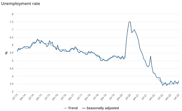 - The number of people in work fell by 14,600 in July and unemployment increased by 35,600. Unemployment increased from 3.5% to 3.7%, slightly higher than market expectations.