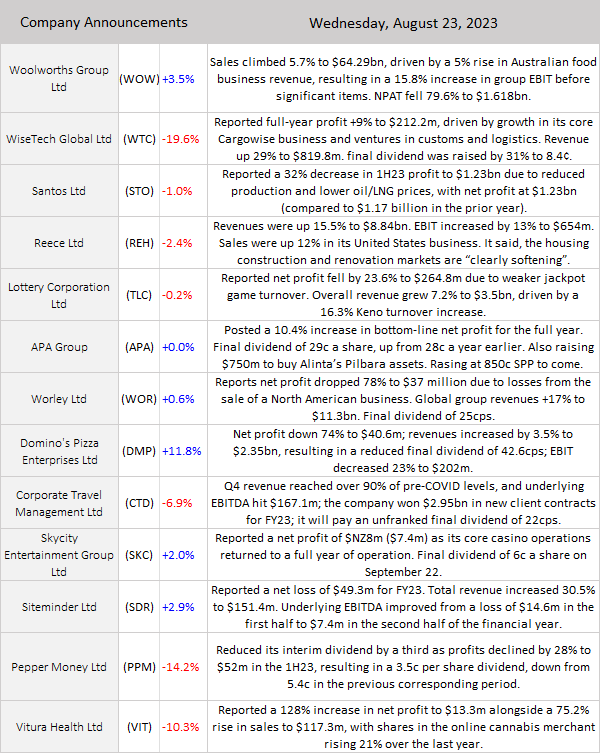 ASX 200 rose 27 points to 7148 (0.4%), bouncing off the important 7100 level. Banks and BHP leading the way. Results continue to surprise.In every sense. The Big Bank Basket rose to $173.08 (+0.8%). Insurers bounced back, QBE up 1.5%, and SUN up 1.3%. MQG going nowhere, down 0.6%. REITs mixed with SCG and VCX easing back. Healthcare remains in ICU as CSL wallows, down 0.4%, RMD off 1.5% and COH falling 0.6%. Industrials were firm, TLS eased after a good run yesterday. WES up 1.2% and WOW rallied 3.5% on good results. COL continued to suffer on downgrades off 0.4%. Tech got whacked as WTC fell 19.6% on an earnings miss. The All–Tech Index cratered, down 1.8%. Resources back in favour, BHP up 1.9%, leading the miners higher. Commodity prices helping, FMG up 2.5% and RIO up 2.4%. Gold miners continued the rally, NCM up 0.4% and NST higher by 1.1%. Lithium stocks found some support, PLS up 1.0% and MIN up 2.8%. Oil and gas eased with WDS off 1.2% and STO continuing to fall on ho-hum numbers. In corporate news, some big companies reporting today, WOW much better than COL. DMP rallied hard on job cuts and a new cunning plan. APA in a trading halt raising $750m to buy some Alinta WA assets. WOR rose 0.6% as profit dropped, REH off 2.4% on slowing demand, and PPM down hard on a dividend cut and a drop in profits. In economic news, Australian Services PMI fell to 46.7 in August. Asian markets mixed again, Japan up 0.4%, HK up 0.5% and China off 0.9%. Dow Futures up 94 points. Nasdaq Futures up 65 points.