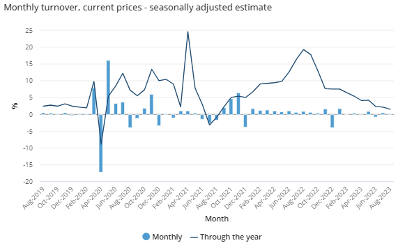 AUSTRALIA RETAIL TRADE – Retail sales growth rose 0.2% M/M in August, missing expectations of 0.3%. This modest increase reflects consumer caution due to high-interest rates. Sales dipped in several sectors, including clothing and food retailing, while department stores saw weaker growth. Overall, retail turnover remained modest across the country.