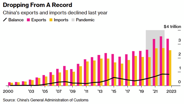 - Chinese exports posted the first full-year decline since 2016 as global demand faltered. China’s exports in dollar terms rose 2.3% from a year earlier while imports expanded 0.2%.