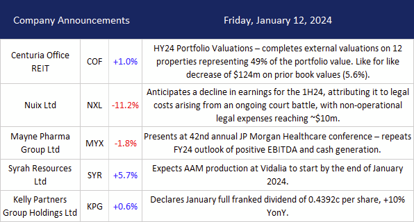 ASX 200 limped into the weekend down 8 points to 7498 to finish the week relatively unchanged. Quiet volumes again. US PPI and Chinese CPI in focus. Banks sagged with the Big Bank Basket down to $193.63(-0.1%). NAB down 0.2% and ANZ falling 0.6%. MQG slid 0.2% with insurers a little better, SUN up 0.8%. REITS mixed with GMG down 0.3% and SGP up 1.1%. In the industries, supermarkets are under pressure as the government pushes for price cutting. The rest of the industrials also drifting lower, TLS off 0.3% and BXB down 0.9% with tech under a little pressure, XRO off 0.8% and utilities falling too. ORG down 0.7% (Ex-Div)and APA down 1.9%. In resources, the ‘Three Amigos’ were a little mixed, FMG up 1.2% with BHP down 0.2%. Lithium stocks mixed, PLS down 1.1% and MIN off 1.4%. Gold miners were slightly higher, and oil and gas stocks better as the UK and US launched an attack against the Houthis in Yemen. Crude rallying around 2%. Uranium stocks on a charge as the price hit a fresh post Fukushima high. In corporate news, NXL warned of higher legal fees falling 12.9%, HLS fell 7.6% after a broker downgrade by Morgan Stanley. SYR rallied 1.9% as cold weather hit Louisiana. There was nothing locally on the economic front; Chinese CPI fell 0.3%, and PPI fell 2.7%. In Asian markets, Japan up 1.1%, China down 0.2% and HK unchanged. 10-year yields, 4.07%.