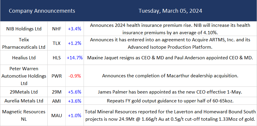 ASX fell 12 points at 7724 (-0.2%). Some weakness in a few sectors weighed. Banks eased back with the Big Bank Basket down to $206.08 (-0.8%). CBA leading the loss, off 1.0%. MQG slipped 0.3%, and GQG fell 1.8%, with REITs down a tad. Industrials weaker across the board, looking a little tired after reporting season. ‘Old Skool Platform’ stocks dropped, with REA off 2.0% and CAR down 1.8%. Tech eased, with the All–Tech Index off 0.3% and supermarkets down. WES off 1.8%, and COL and WOW falling too. Ex-dividends weighing. In resource stocks, iron ore miners perked up on Chinese stimulus hopes (again), BHP up 0.9% and FMG bouncing 1.9%. Lithium stocks pummelled as the rally ended abruptly. PLS dropped 7.0%, and MIN off 3.6%. Lithium in China fell, and Tesla ran into sellers in US. Gold miners in demand as bullion hit records. NST up 3.0%, and NEM up 5.5%, playing some catch-up. Oil and gas stocks slipped, with WDS down 0.8%. In corporate news, MPL and NHF rose on premium increase news, HLS was a star performer as the CEO stepped down up 14.7%, and in economic news, the current account returned to a surplus, beating forecasts. GDP tomorrow. Asian markets sank on Chinese GDP news, HK off 2.2% and China up 0.2%, with Japan still at all-time highs up 0.6%. 10Y yields falling to 4.1%. Dow Futures down 68 points. NASDAQ Futures down 61 points.