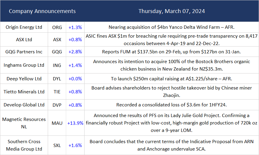 ASX 200 finished up 30 points to 7758 (+0.4%) despite the heavy weight of large-cap ex-dividends. Once again, banks leading the way with the Big Bank Basket up to $209.87 (+0.7%). MQG rose 0.8%, and CBA hit record highs up 0.8%. GQG rose 2.8% on FUM news, ASX up 0.8% despite being fined by ASIC. Industrials firm WES up 1.5%, and TCL up 1.0% as rates fall. WOW and COL better, utilities firmed with ORG up 1.3% and tech better, WTC up 1.1% and XRO up 0.1%. REITs slightly better. Healthcare rose on RMD moving up 5.5%. Resources were mixed, BHP and RIO fell on dividends, FMG rose 1.1% with base metals finding buyers, S32 up 0.7% and MIN up 3.9%. Gold miners better on record bullion prices, NST up 2.6% and EVN up 2.8%. Lithium stocks mixed, PLS down 1.0% and uranium stocks static as DYL moved to raise $220m in a placement. In corporate news, RMS in a trading halt pending news on an acquisition, TIE rose 0.8% after rejecting a takeover, MAU rose 13.9% on its PFS for Lady Julie project. In economic news, CBA is staying dovish on rates with forecast of 75bps easing in 2024. Capex is increasing in large caps, pointing to increased M&A perhaps. In Asian markets, a little weaker across the board, HK off 0.5% and China down 0.2% with Japan falling 0.3%. 10-year yields steady at 4.02%. Dow Futures down 42 points. NASDAQ Futures down 69 points.