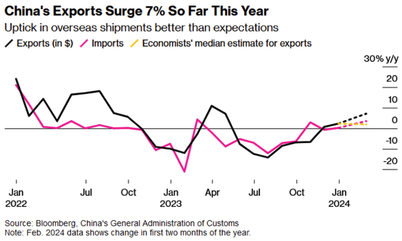 - China’s exports grew much faster than expected in the first two months of 2024. Overseas shipments in US dollar terms rose 7.1% in the January-February period from a year earlier, well above the 1.9% forecast by economists.