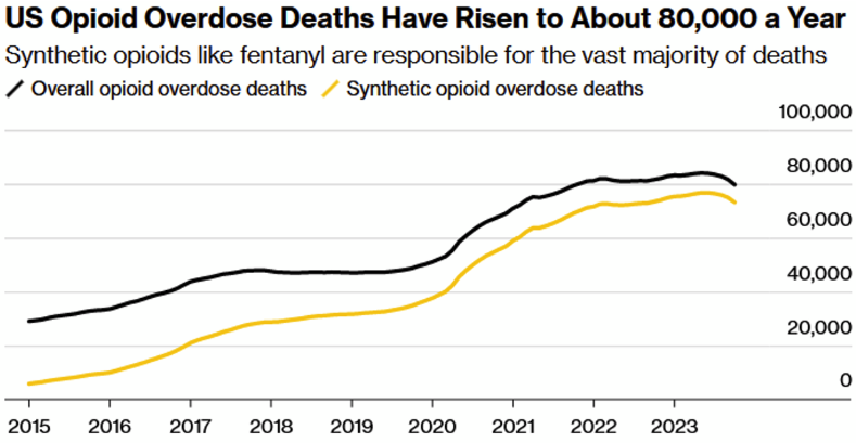 - From just before the start of the Covid-19 pandemic in November 2019 to October 2023, about 270,000 people died of an overdose of Fentanyl in the US. Big election issue.