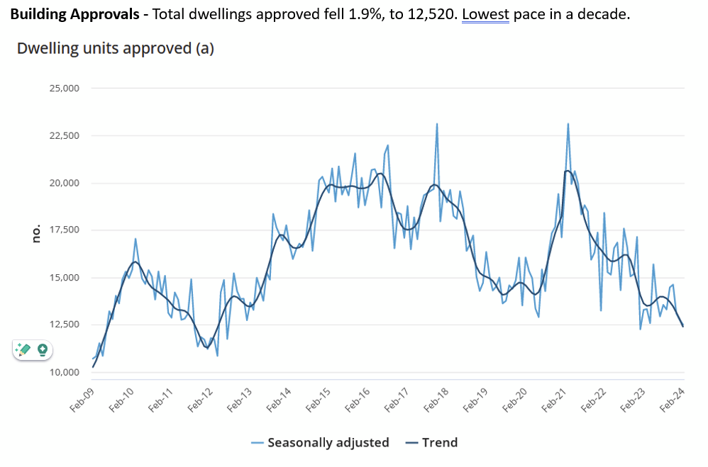 Building Approvals – Total dwellings approved fell 1.9%, to 12,520. Lowest pace in a decade.