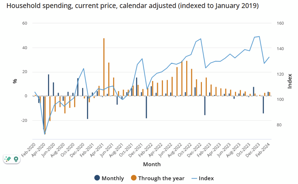 - Throughout the year, household spending increased for both services (+5.1%) and goods (+1.9%).