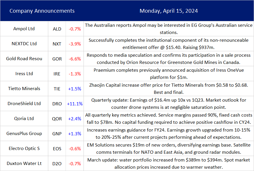The ASX 200 has dropped 36 points to 7753 (0.5%) on US falls. Banks eased back led lower by CBA down 1.4% with the Big Bank Basket down to $203.73 (0.8%). Insurers fell away as did MQG off 0.8% and GQG off 4.2%. REITs fell too, GMG down 0.8% and SGP off 0.9%. Industrials with a light dusting of negativity across the board. Tech eased with WTC off 1.2% and XRO down 1.7%. Interest rate sensitive stocks fell TCL off 0.8% and REA falling 0.7%. Retailers also slipping lower, JBH down 0.5% and APE off 1.1%. In resources, Iron ore was the bright spot as BHP rose 0.6%, RIO shooting the lights out up 3.6% and FMG flat. Gold miners fell despite record high bullion prices, EVN down 1.3%, GMD falling 4.5% and GOR down 6.6% on a potential acquisition. Lithium stocks remain under pressure, PLS down 3.7% with LTR off 2.7%. Aluminium and Nickel stocks doing well on LME changes, AWC up 6.0% and NIC up 4.1%. Oil and gas modestly better, and coal is up slightly. In corporate news, TIE received a revised bid, NXT returned to trade following rights issue, little else. No economic news. In Asian markets, Japan slipped 0.2%, China up 1% and HK down 0.6%. 10-year yields rising to 4.26%.