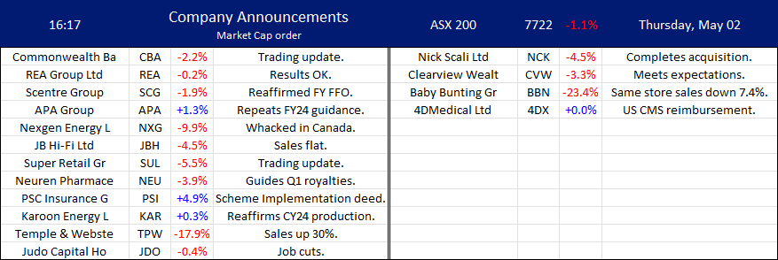 ASX 200 retreated significantly as bank weakness, retail woes and commodity issues pushed us down 83 points to 7722 (-1.1%). CBA fell 2.2% on quarterly update, WBC crashed on ex-dividend down 5.6%, with the Big Bank Basket down to $205.72 (-2.4%). MQG was a patch of green with REITs off too, GMG falling 1.67%, MGR falling 1.0%. Insurers steady QBE up 0.6% and SUN better as yields rallied to 4.35%. Flight to safety. Healthcare under pressure, CSL down 1.0% with RMD falling 2.3% and tech off as WTC fell 1.1% and XRO down 1.4%. The All–Tech Index fell 0.6%. Industrials swooned on some retail updates at Macquarie Conference, JBH down 2.5%, SUL off 5.5%, and WES down 3.5%. QAN still finding some friends up 1.5%. In resources, BHP and FMG down around 0.8%, with lithium stocks a little weaker, PLS down 0.2%. Gold miners under pressure, DEG pulling $600m from gold investors not helping. NST down 0.8%, and RED off 1.1%. Oil and gas better, WDS up 0.8% and STO up 0.9% on new government commitment to gas. On the corporate front, BBN spat the dummy dropping 23.4% on an up (down) date. SUL down 5.5% on its sales update, and TPW gave up some serious ground on its latest sales numbers, falling 17.9%. JDO fell 0.4% on an update, and ORI exploded 0.6% higher on its update. On the economic front, better Chinese export numbers. Locally weekly payroll jobs down 0.6% in the month since March 16th. Asian better, with Japan up 0.3% and HK up 1.1% with China up 0.8%. Yields higher at 4.35% in 10Y notes. Dow and NASDAQ Futures down 42 and 41 points, respectively.