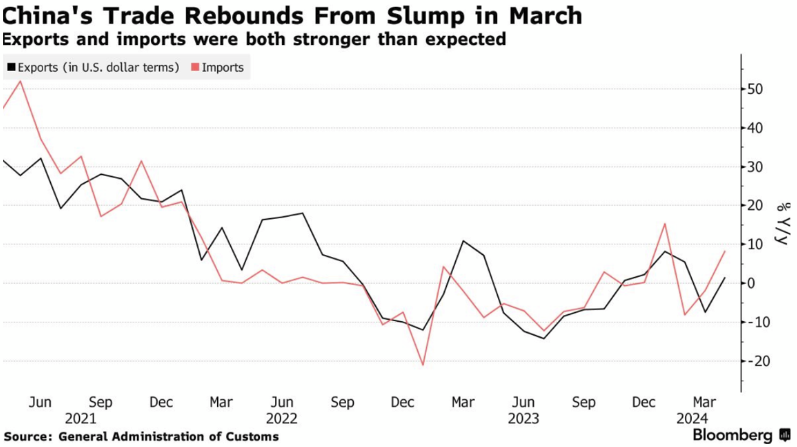 - Chinese trade data – Exports increased 1.5% in dollar terms from a year earlier, reversing a drop in March, while imports climbed 8.4%, the customs administration said