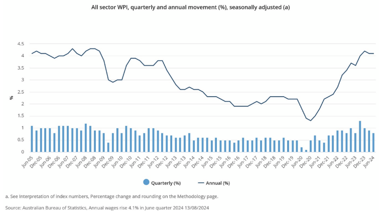- The Wage Price Index (WPI) rose 0.8%in June quarter 2024 and 4.1% for the year.