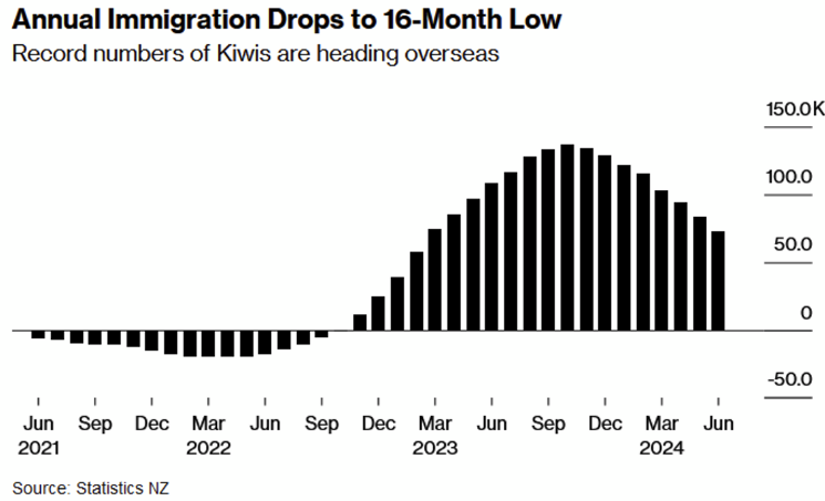 - New Zealand immigration slowed to its weakest in 16 months as record numbers of citizens head overseas for job opportunities and better pay. 38% of departing citizens were aged between 18 and 30, the statistics agency said. About half were destined for Australia, it added.