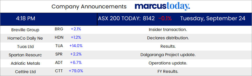 ASX 200 fell 11 points to 8142 (-0.1%) on a big day of divergence. The great rotation kicked in with resources doing very well following the PBoC firing its ‘bazooka’ and the banks fell after the RBA held rates unchanged for the same reason as last time. The Big Bank Basket fell to $240.49 (-2.8%) as CBA dropped 3.0% and NAB fell 3.0%. Other financials held, with MQG up 0.9% and CGF up 1.3%. Insurers eased back slightly, SUN down 1.5%. REITs steady as GMG rose 1.1% and SGP up 1.0%. Industrials were mixed again, WOW and COL on the nose, falling around 3% on ACCC concerns. WES off 0.7% and ALL rallied 2.1% as LNW fell 18.4% on a Nevada court ruling. Tech mixed, the All Tech Index up 0.4%. QAN up 1.0% heading for an all-time high! It was a better picture in resources, following the PBoC move, BHP rallied 3.3% with RIO up 3.7% and FMG trailing up only 1.8%. Lithium miners were squeezed higher, PLS up 4.7% and MIN up 6.5%. S32 had a good day up 4.1% with BSL up 1.2%. Gold miners were weaker, EVN up 1.4% the exception. Uranium stocks glowing again today as shorts continue to cover on Microsoft’s move to shore up power. DYL up 10.6% and PDN up 10.1%. Oil and gas pushed slightly higher. In corporate news, CTT had their accounts signed off by the auditor and raced 79% ahead! In economic news, RBA and PBoC hogged the limelight. Asian markets firmed, Japan up 0.5%, HK up 3.5% and China up 3.8%. 10Y yields steady at 3.90% on RBA.