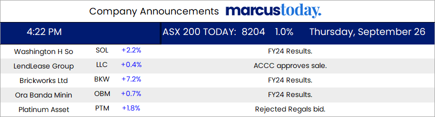ASX 200 closed up 77 points to 8204 (+1.0%) as resources took off again and banks stabilised. More Chinese stimulus announced. Modest losses in the big four with CBA down 0.4% and WBC off 0.7% with the Big Bank Basket at $235.04 (-0.3%). MQG ran 1.8% higher to a new record, Insurers better too, QBE up 0.5% and MPL up 1.7%. REITs also in demand with GMG up 0.5% and SCG rising 1.6%. Industrials were firm across the board, QAN took off another 2.1% with ALL 2.8% better. WES rose 1.5% as WOW and COL also rose today. Tech was strong with WTC up 2.8% and XRO a more modest 0.3%. The All–Tech Index up 2.0%. Resources once again found buyers, BHP, RIO and FMG all doing well after a slow start. FMG up 2.9% the best of the three. Lithium stocks making small headway, PLS up 1.4% and MIN flying again up 4.5%. Gold miners better too, EVN up 2.7% and NST rallying 0.6% with uranium stocks glowing red hot, PDN up 7.6% and BOE up 5.4%. LYC continued to impress running 1.7% higher. Oil and gas a sullen place today with WDS down 2.7% and STO off 2.3%. Coal stocks better again. In corporate news, PTM knocked back the RPL bid officially, SOL and BKW reported and saw an increase in dividend for SOL again. LLC got the nod from the ACCC, SGR revealed it had fallen to a $1.7bn loss. In economic news, job vacancies are falling as the RBA wishes. Asian markets firmed on fresh Chinese stimulus. Japan up 2.7%, HK up 3.1% and China up 2.5%. 10Y yields steady at 3.95%. Dow Futures up 145 points (+0.3%) and NASDAQ Futures up 241 points (+1.2%).