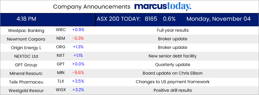 ASX 200 kicks 46 points higher to 8165 (+0.6%). Banks and industrials leading the charge higher. WBC rose 0.9% on a higher dividend and an extension of the buyback. CBA up 1.6% and the Big Bank Basket up to $246.72 (+1.3%). REITs slightly positive, SCG up 0.3% and tech and industrials better, WTC rallied another 2.6% on the calm, XRO up 1.4% and the All–Tech Index up 1.23%. QAN rallied another 1.5% with TCL rallying 2.1%. Healthcare better too, CSL up 1.7%. Resources were mixed, MIN fell 9.6% on the inquiry update that satisfied no one. Iron ore miners eased, BHP down 0.4% and RIO off 1.3% with gold miners slightly better, NST up 0.9% and WGX up 3.2%. Oil and gas stocks pretty flat and uranium stocks slid on lower spot prices, PDN down 3.3% and BOE falling 7.8%. In corporate news, TLX rose 3.5% on some reimbursement news, SGR fell 6.7% as a big line was traded at 20c. GPT reaffirmed guidance, FBU rose 1.5% on NZ Commerce Commission news. Nothing significant on the economic front, some ANZ jobs numbers with China, central banks and US elections the focus. Asian markets better with China up 0.5%, HK up 0.1%. Japan closed for Culture Day. 10Y yields continuing to rise to 4.56%. Dow Futures down 26 points. NASDAQ Futures up 75 points.