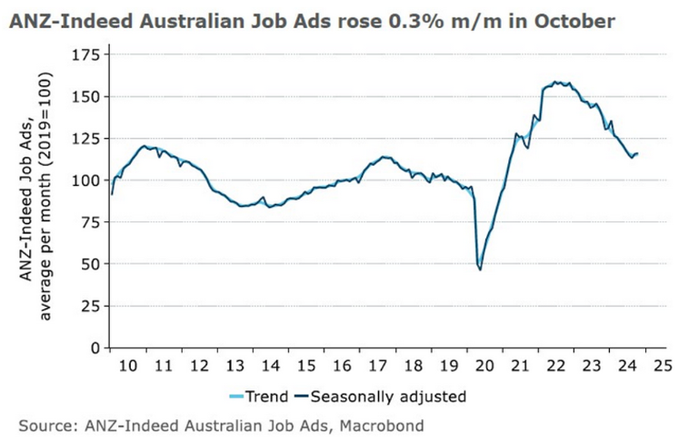 - Australian job ads rose 0.3% in October, from September when it gained an upwardly revised 2.3%, the second consecutive month of rises, according to a private survey by ANZ-Indeed. Growth in job ads in October was “Christmas-themed”, with both retail and food service opportunities rising considerably.