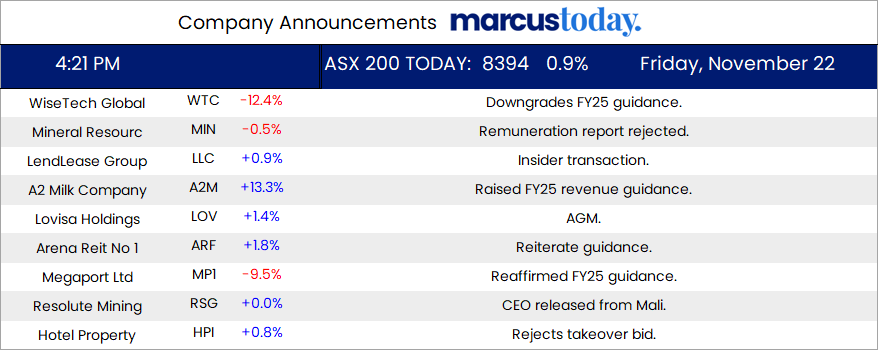 ASX 200 finished the week up 71 points at a new 8394 record. Up 1.3% for the week. All sectors firing with the banks pushing up yet again. CBA up another 1.8% and NAB up 1.3% with the Big Bank Basket at $265.19 (+1.4%). MQG up 1.0% and financials better, SOL up 1.0% and ASX up 1.4%. REITs firmed, GMG up 0.5% and SGP up 1.2%. Industrials solid as a rock, WES up 1.8% and TLS up 0.3% with CSL bouncing back again, PME doing what it does best up 3.4%. BXB another day in the green up 0.5% with retail finding support. Black Friday sales kicking off, JBH up 1.6% and LOV rebounding from early losses, up 1.4%. ALL fell 1.7% and LNW up 3.6%. Resources were slightly higher, BHP up 0.9% and FMG up 1.1%. Gold miners are better again as bullion rose on increased geo-political risk, NST up 1.9% and EVN up 1.0%. Lithium and rare earths remain in the “Chateau de Chien”. PLS down 6.8% and LYC off 1.0%. Oil and gas stocks are in demand, WDS up 2.2% and uranium pushing higher, PDN up 5.9%. In corporate news, another 25 AGMs today, WTC fell 12.4% on a profit downgrade, and MP1 fell 9.5% after reaffirming its earnings outlook. KGN fell 2.7% on its earnings update. A2M up 13.3% on better earnings and dividend policy. No significant economic updates locally. Asian markets mixed again, with Japan up 0.7% with China and HK down over 1%. 10Y yields steady at 4.55%.