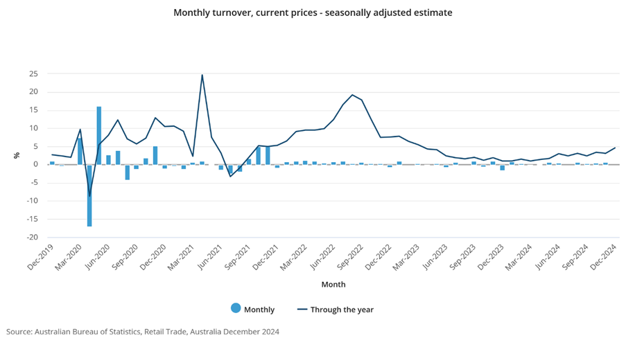 - Australian retail sales slipped 0.1% from November to December, beating forecasts of a 0.7% drop and following two months of solid gains.