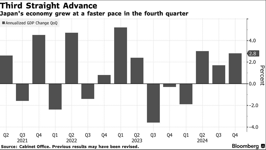 - Japan’s GDP expands at annualised clip of 2.8%, giving yen a boost. Private consumption edged higher in the quarter, exceeding forecasts, but it slowed markedly versus the prior quarter.