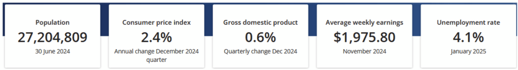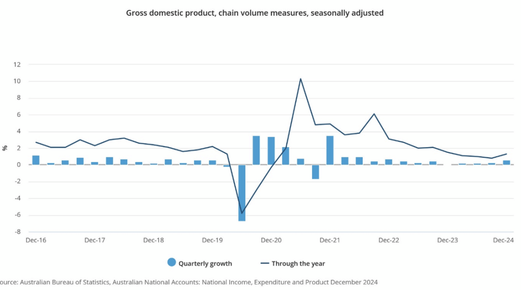 Australian gross domestic product (GDP) rose 0.6% in the December quarter 2024 and 1.3% through the year (seasonally adjusted, chain volume measure).