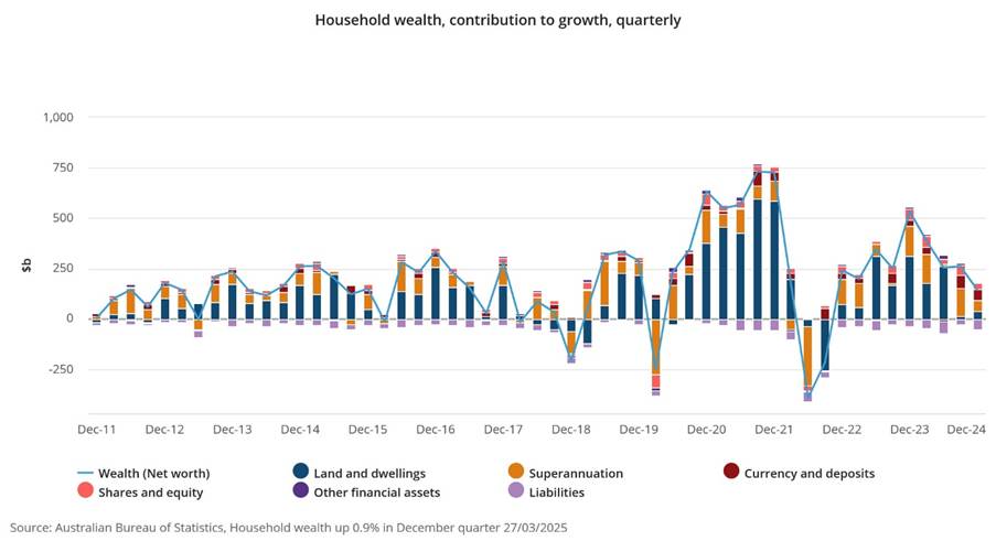 - Household wealth was up 0.9% or $143.6bn in December quarter 2024, the lowest growth since September quarter 2022.