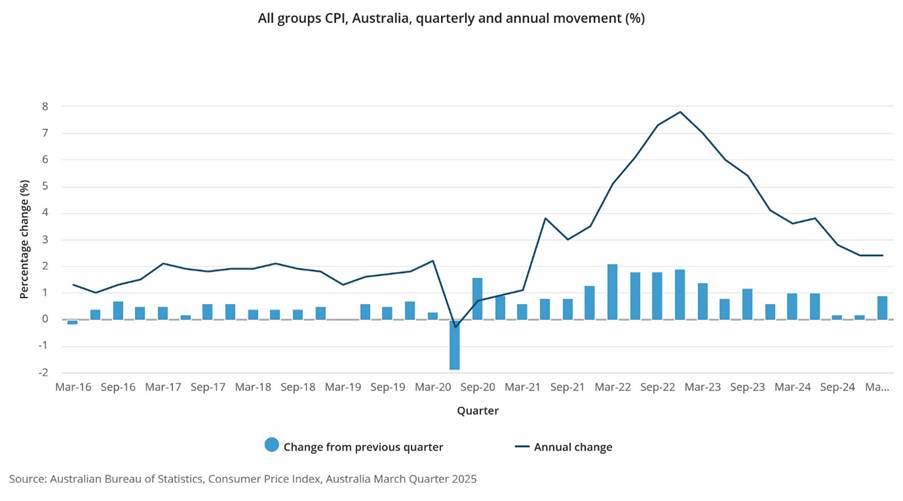The Consumer Price Index (CPI) rose 0.9% this quarter. Over the twelve months to the March 2025 quarter, the CPI rose 2.4%. The most significant price rises this quarter were Housing (+1.7%), Education (+5.2%) and Food and non-alcoholic beverages (+1.2%).