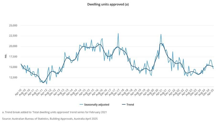 - The April 2025 seasonally adjusted estimate: Total dwellings approved fell 5.7%, to 14,633. Private sector dwellings excluding houses fell 19.0%, to 4,999, while private sector houses rose 3.1%, to 9,349.