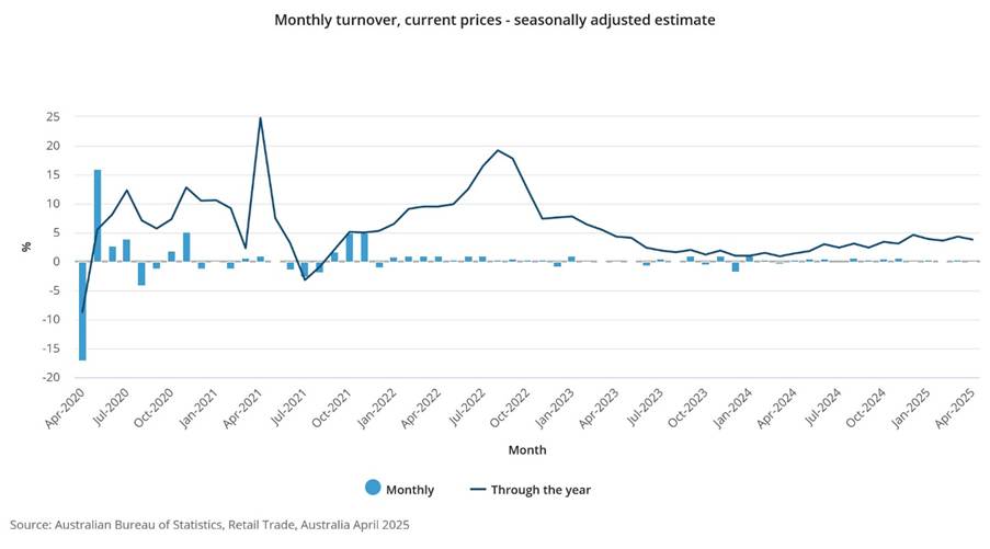 - The April 2025 seasonally adjusted estimate: Fell 0.1% month-on-month. Rose 3.8% compared with April 2024.
