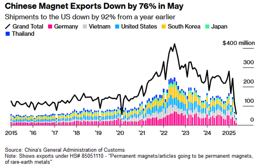 - Chinese exports of rare earth magnets slumped further in May.