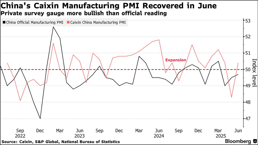 - China’s manufacturing activity rebounded in June, according to a private survey. The Caixin manufacturing purchasing managers index rose to 50.4 from 48.3 in May.