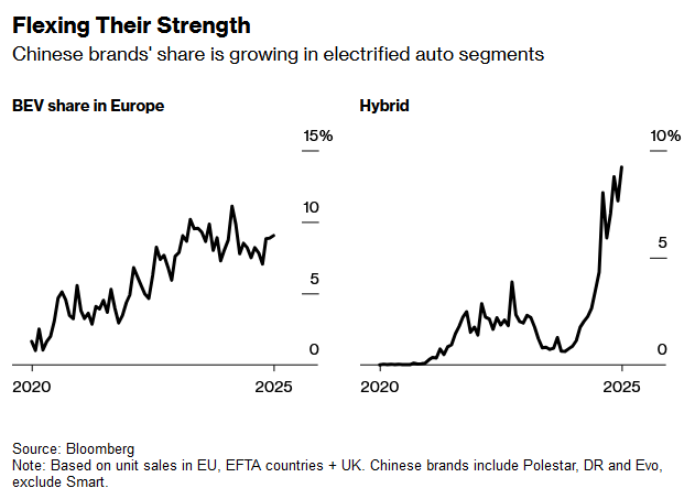 - Chinese automakers continued to expand their European foothold in May, capturing the highest share ever of hybrid–car sales and the biggest slice of the electric–vehicle market in 10 months.