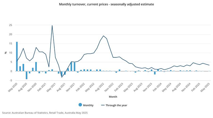 - Retails sales number slightly below forecast. Rose 0.2% month-on-month. Rose 3.3% compared with May 2024.