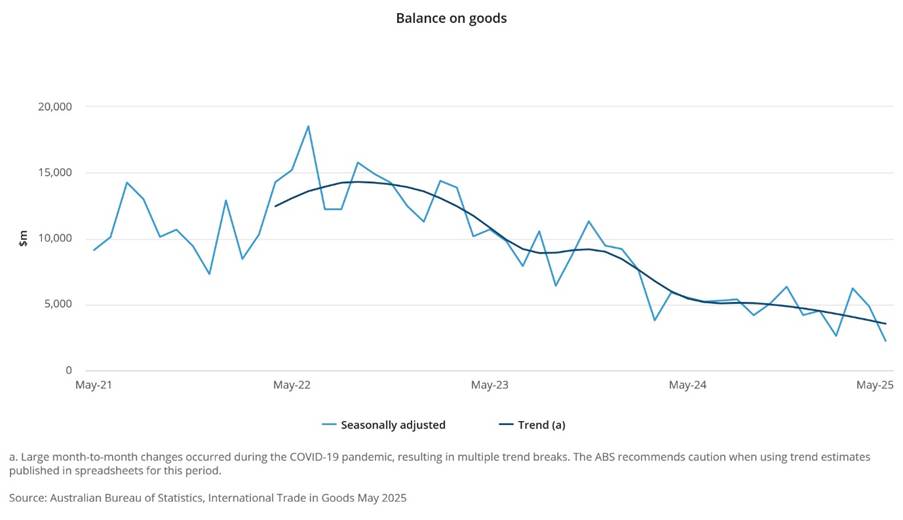 - Australian trade deficit. The seasonally adjusted balance on goods decreased $2,621m in May.