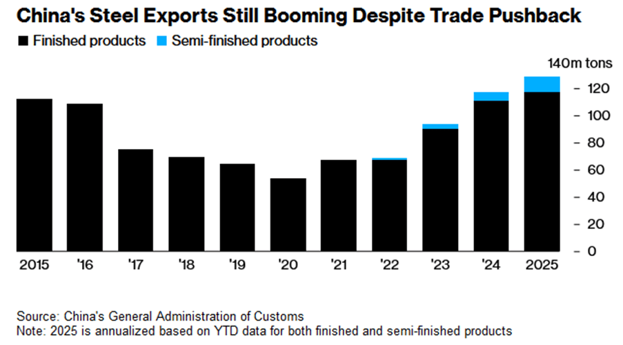 - Chinese Shipments of finished steel used in construction to cars and appliances reached 30.7 million tons for the three months from April to June. That’s up 11% from a year earlier and beats the previous quarterly peak during a flood of exports a decade ago.