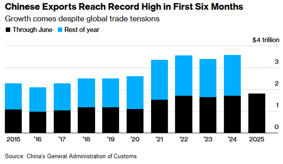 - China ended the first half of the year with a record trade surplus of about $586 billion after exports to the US began to stabilise. Exports rose 5.8% in June from a year earlier to $325bn. Imports rose 1.1% to grow for the first time since February.