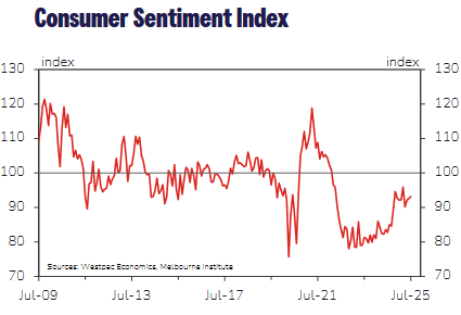 - The Westpac–Melbourne Institute Consumer Sentiment Index ticked 0.6% higher to 93.1 in July from 92.6 in June.