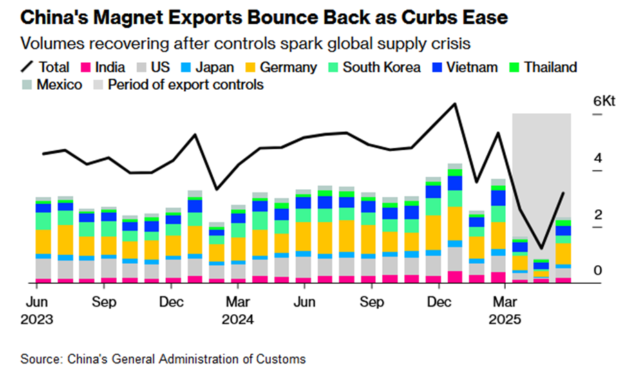 - China boosted shipments of rare earth magnets in June – including to the US – after a global supply squeeze threatened factory closures and inflamed trade tensions.