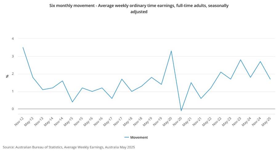 - Estimates for average weekly ordinary time earnings for full-time adults (seasonally adjusted) increased by 4.5% annually to $2,010.00 in May 2025.